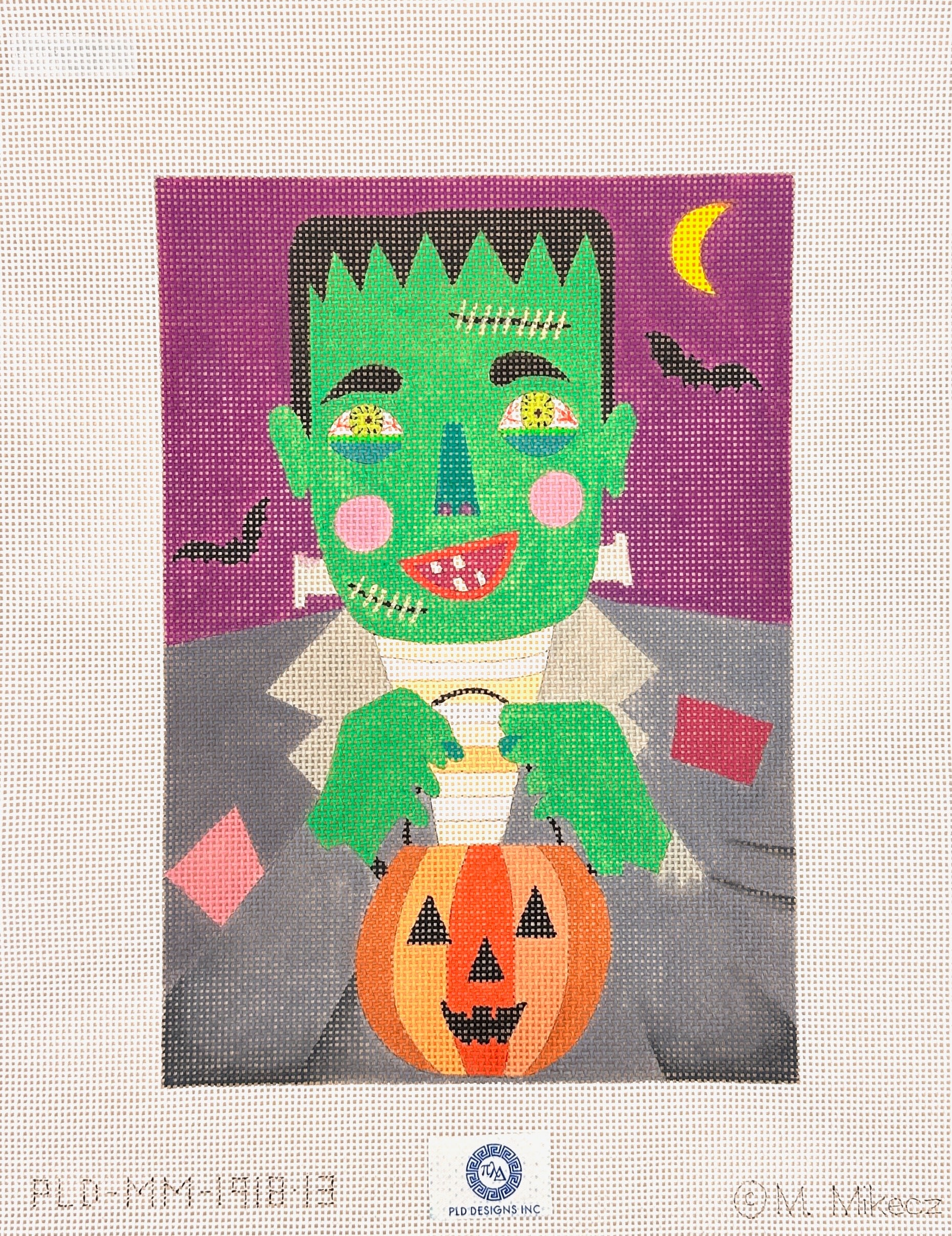 This is a needlepoint canvas by Melania Mikecz from PLD Designs. It features a Frankenstein happily trick or treating.