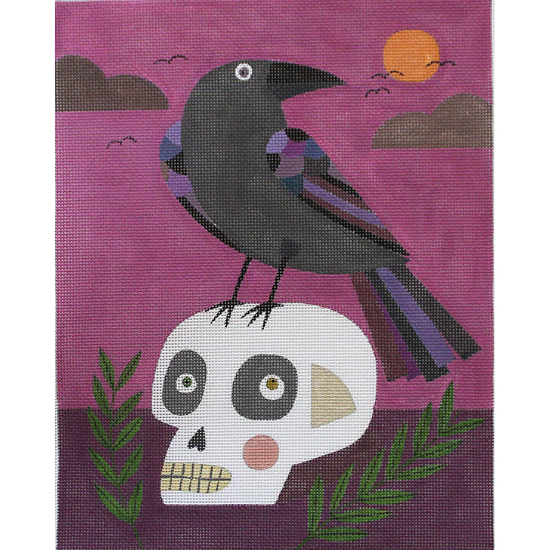 This hand painted needlepoint canvas by Melanie Mikecz for PLD Designs features a handsome crow sitting on a skull.