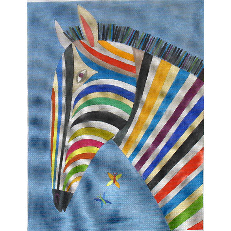 This hand painted needlepoint canvas by Melanie Mikecz for PLD Designs features a colorful striped zebra.