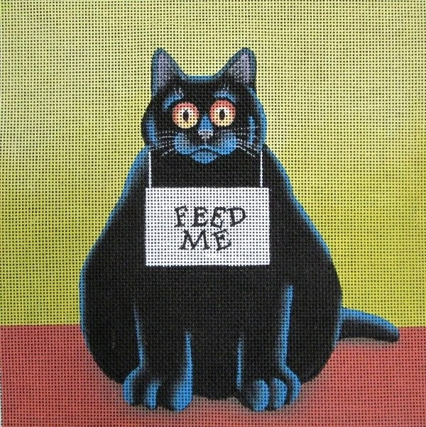 This hand painted needlepoint canvas by Vicky Mount for PLD Designs features a portly black cat wearing a "Feed Me" sign..