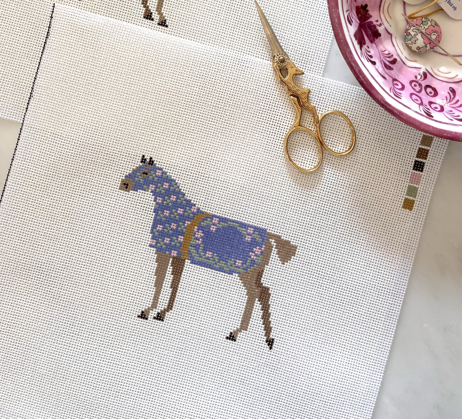 By Danielle Demers for Plum Stitchery, this hand painted needlepoint canvas features a horse in an elegant floral lilac caparison.