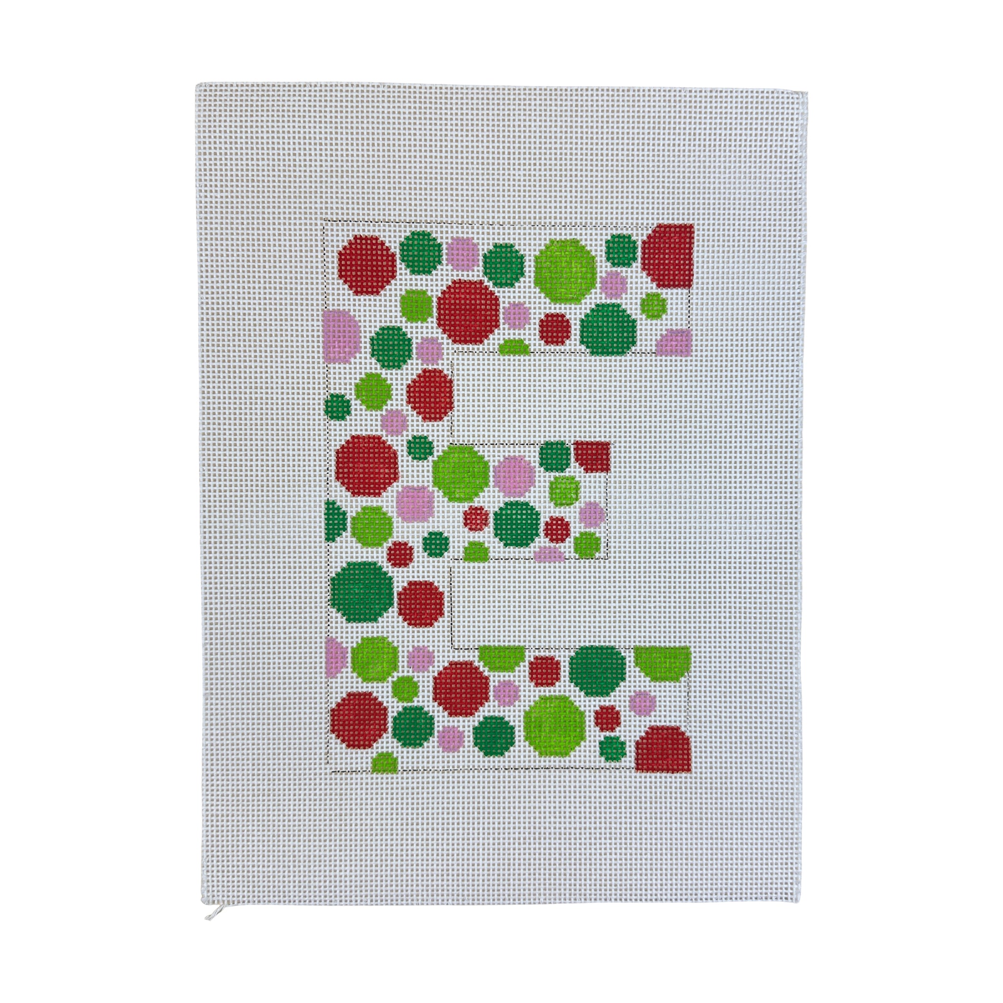 This hand painted needlepoint canvas features a letter E with pink, red and green polka dots.