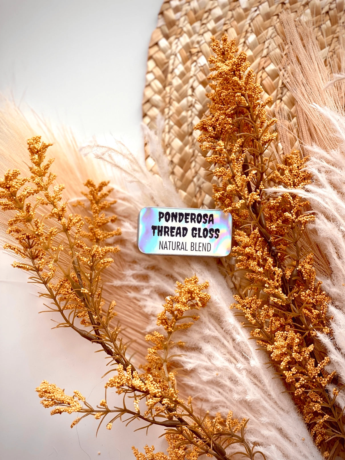 The Natural thread gloss contains Beeswax and Coconut Oil, unscented except for the naturally fragrant organic and local beeswax. A calming neutral among the chaos of life.