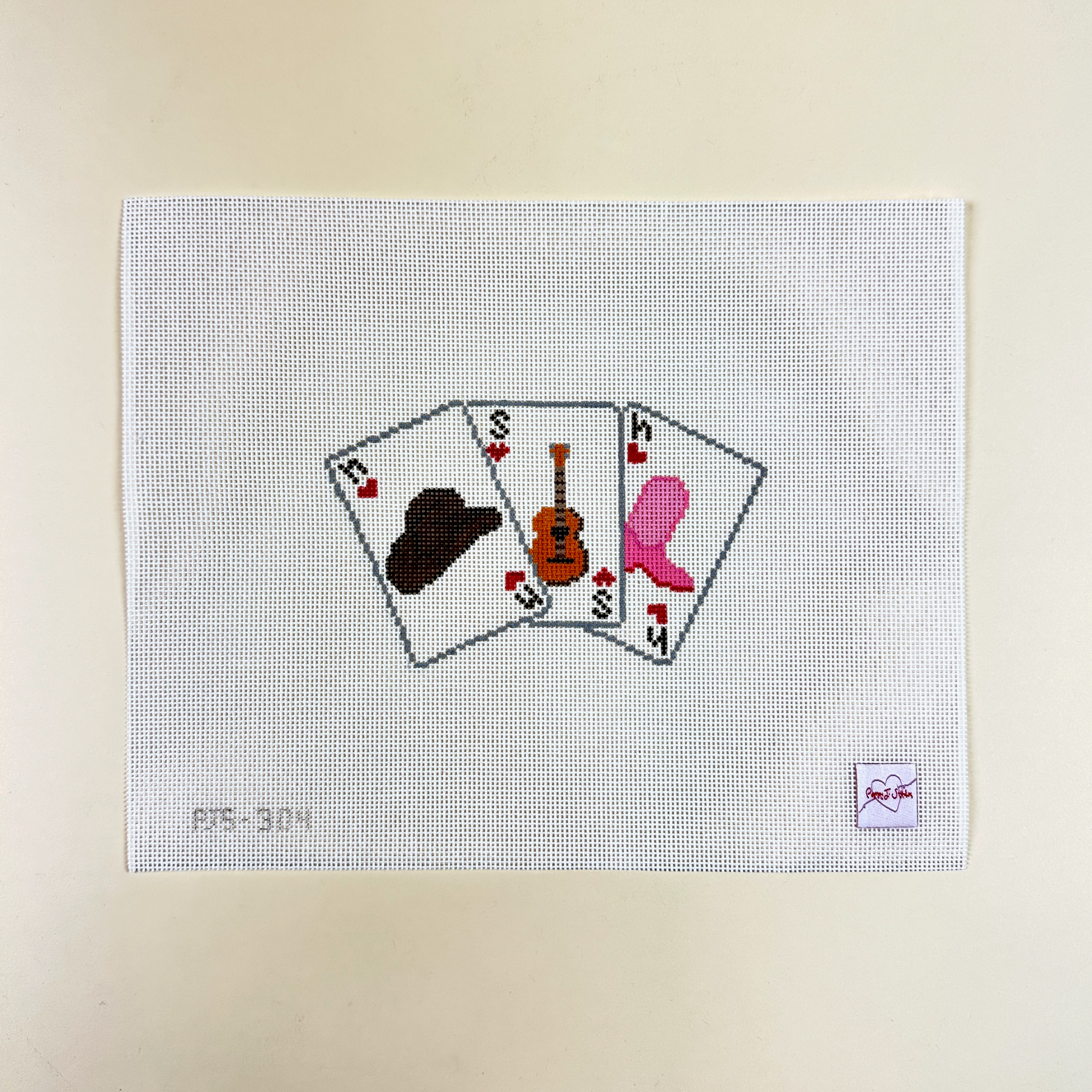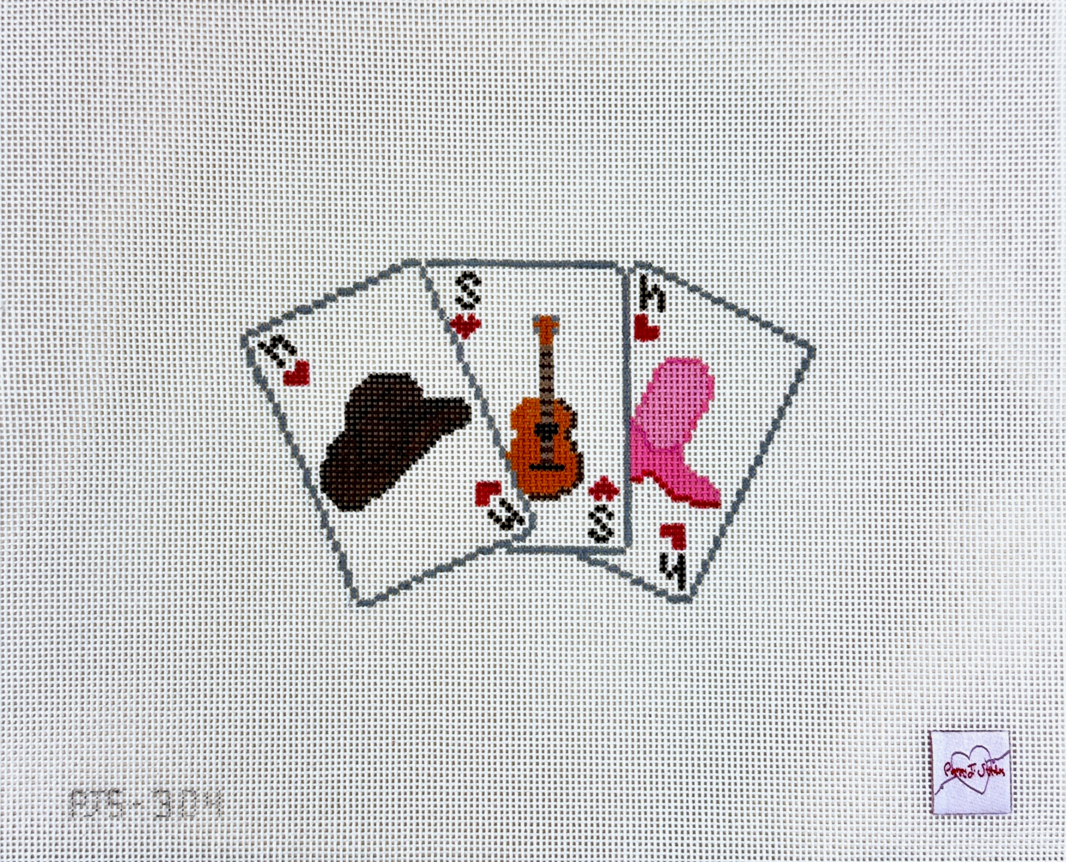 This hand painted needlepoint canvas by Poppy J Stitches features Nashville themed playing cards.