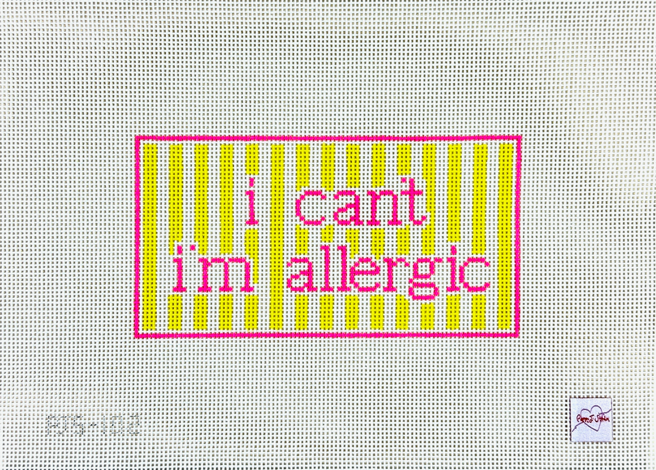 This hand painted needlepoint canvas by Poppy J Stitches features a sign with "i can't I'm allergic".