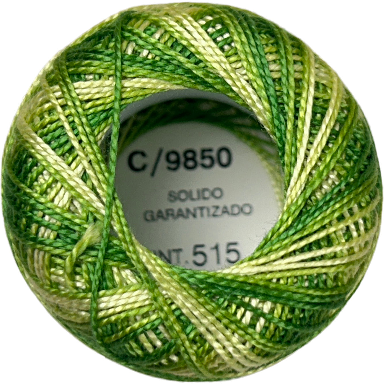 This is Perle Cotton Size 8 from Presencia in color 9850 Variegated Yellow Green. Durable cotton thread, perfect for quilting and Sashiko. 1 ply on 18 mesh for light coverage.