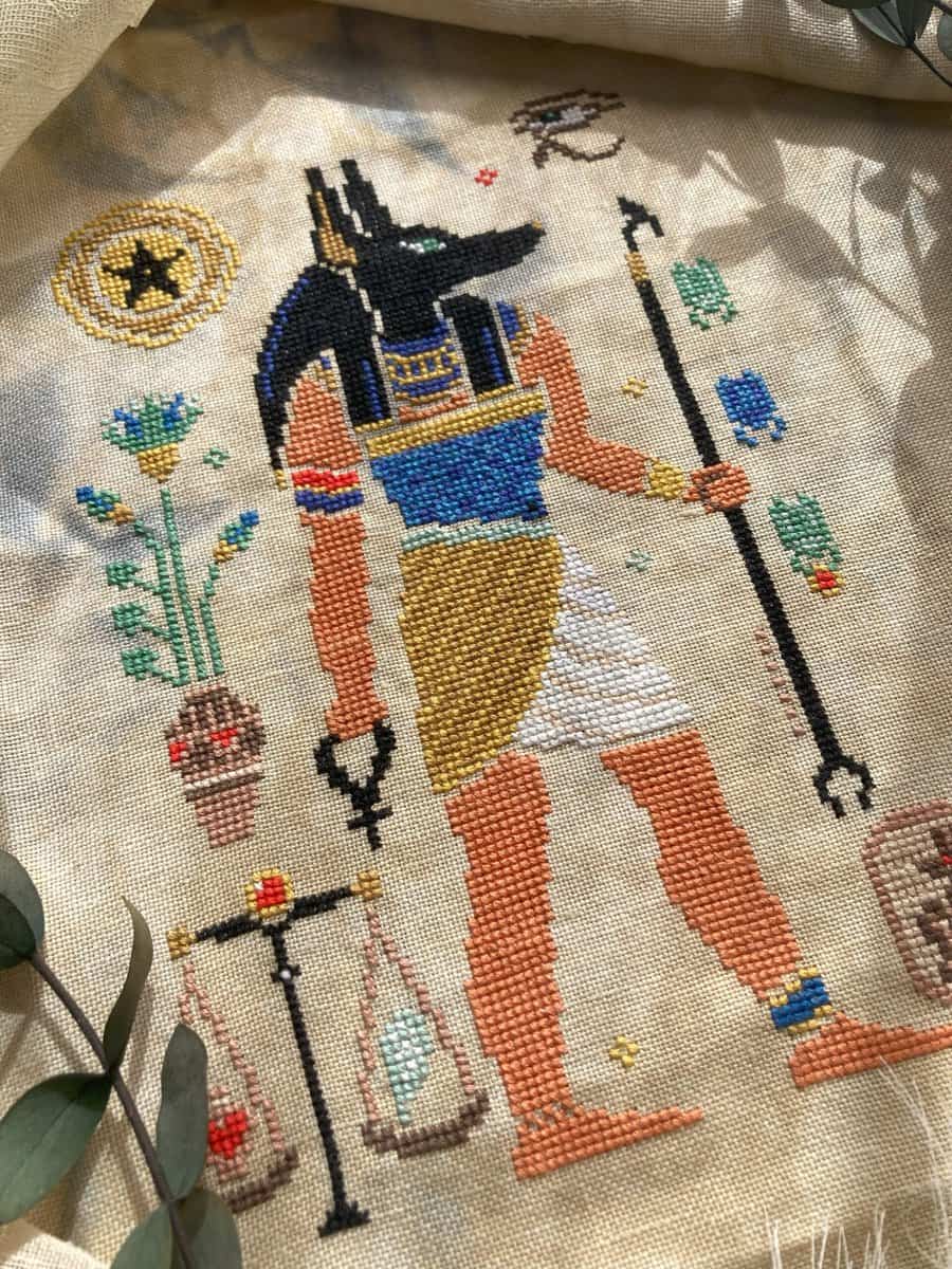 This printed cross stitch pattern by Quaternion Creations features Anubis, the mysterious Egyptian underworld god with symbols of his craft. As stitched, this pattern uses DMC floss.
