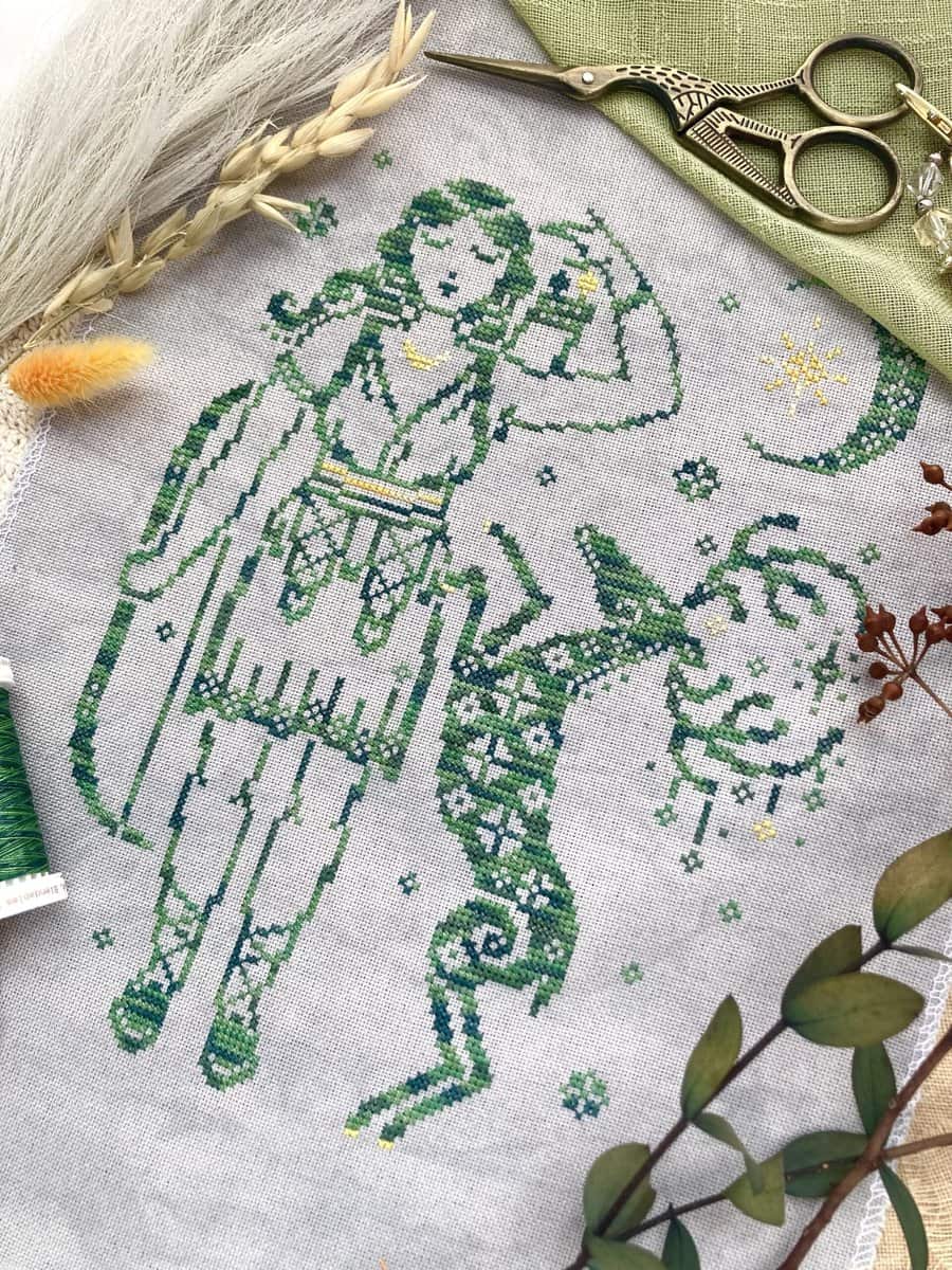 This printed cross stitch pattern by Quaternion Creations features Artemis, the Greek goddess of the hunt and wilderness. Artemis is a fierce and independent deity, often shown striding through the forest with a bow in hand and a quiver at her back, accompanied by a deer or hound. As the eternal maiden and protector of wildlife, she embodies the untamed freedom of the natural world. This cross stitch design of Artemis is inspired by Greek myths and vase images. As stitched, this pattern uses Sulky Petites - DMC conversions included.