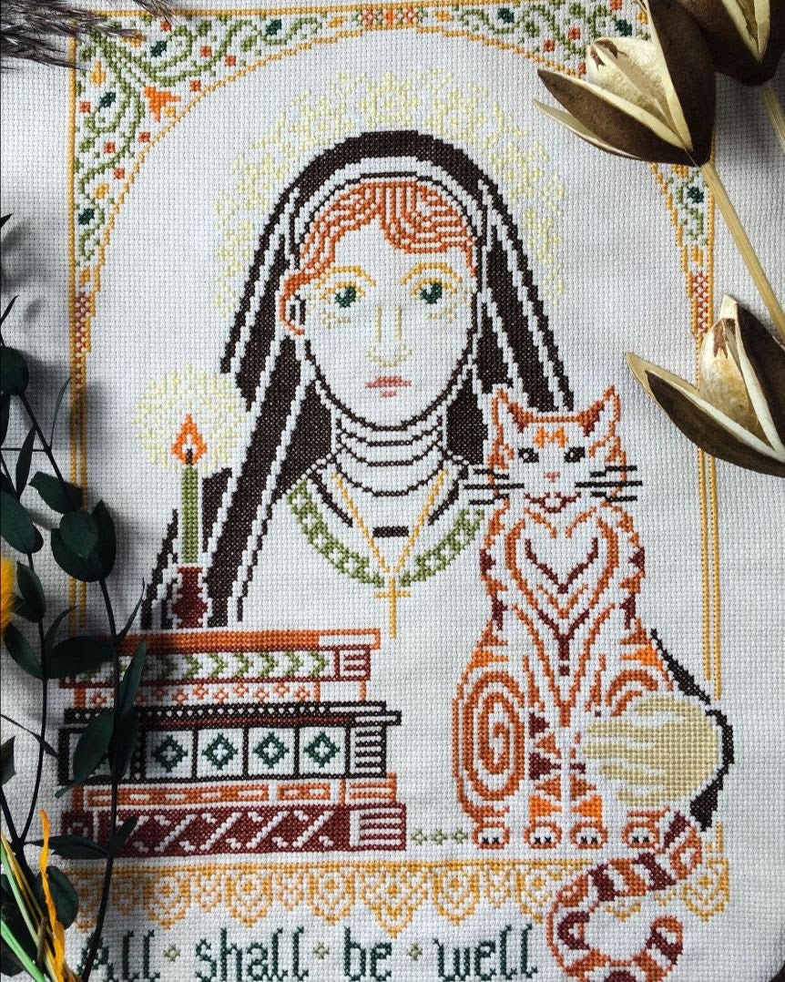 This printed cross stitch pattern by Quaternion Creations features St Julian of Norwich, a Middle Age recluse and mystic. “All shall be well, and all shall be well, and all manner of thing shall be well” – these words are the best known part of a book she wrote. St Julian of Norwich was the author of the earliest surviving English language works written by a woman.