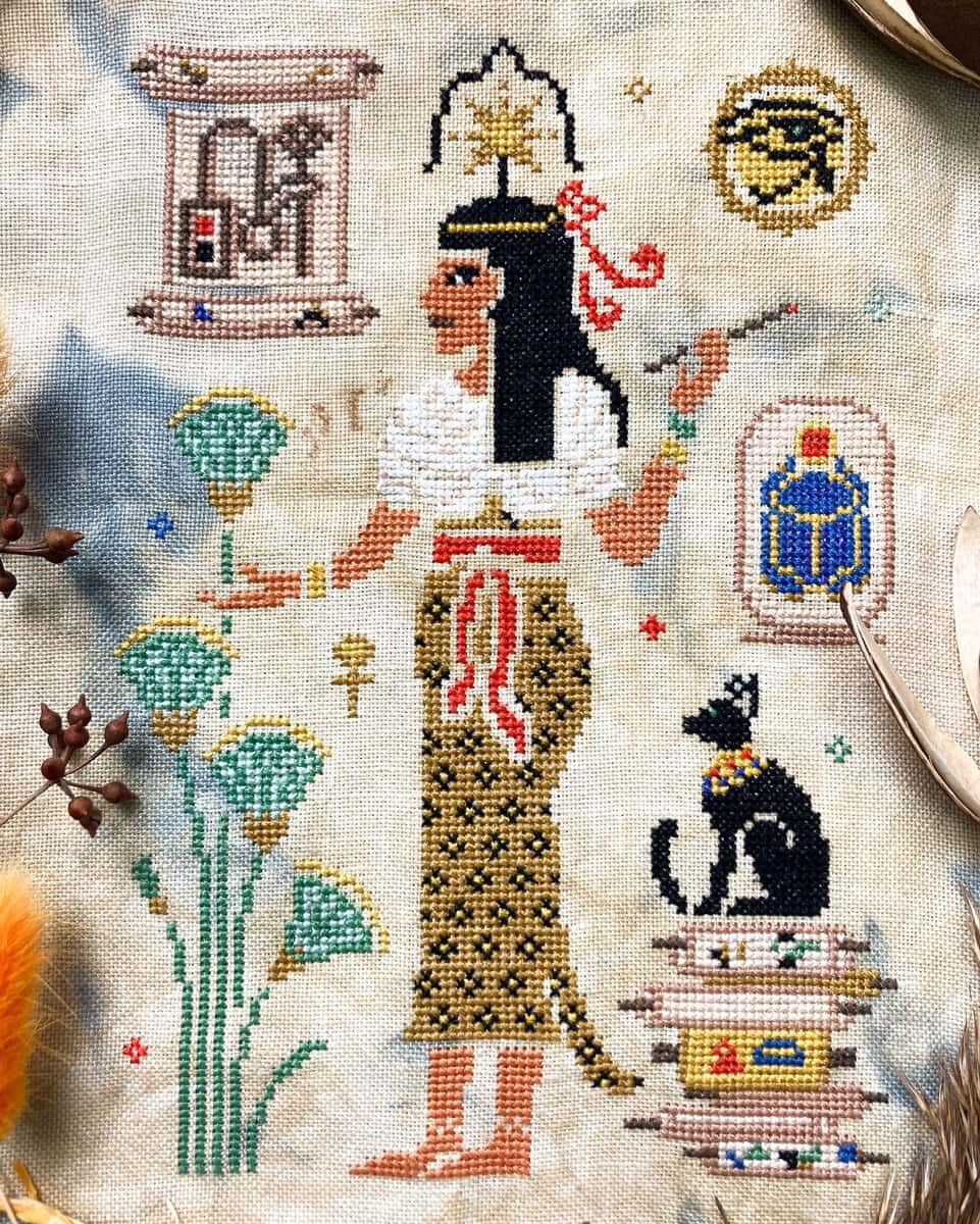 This printed cross stitch pattern by Quaternion Creations features Seshat, the ancient Egyptian goddess of writing, wisdom, and knowledge. Seshat is often depicted wearing a leopard skin dress and a headdress with a star on top. She was revered as the deity of libraries, measurement, and architecture, overseeing historical records, calculations, and the construction of temples and monuments in Egyptian mythology. As stitched, this pattern uses DMC floss.