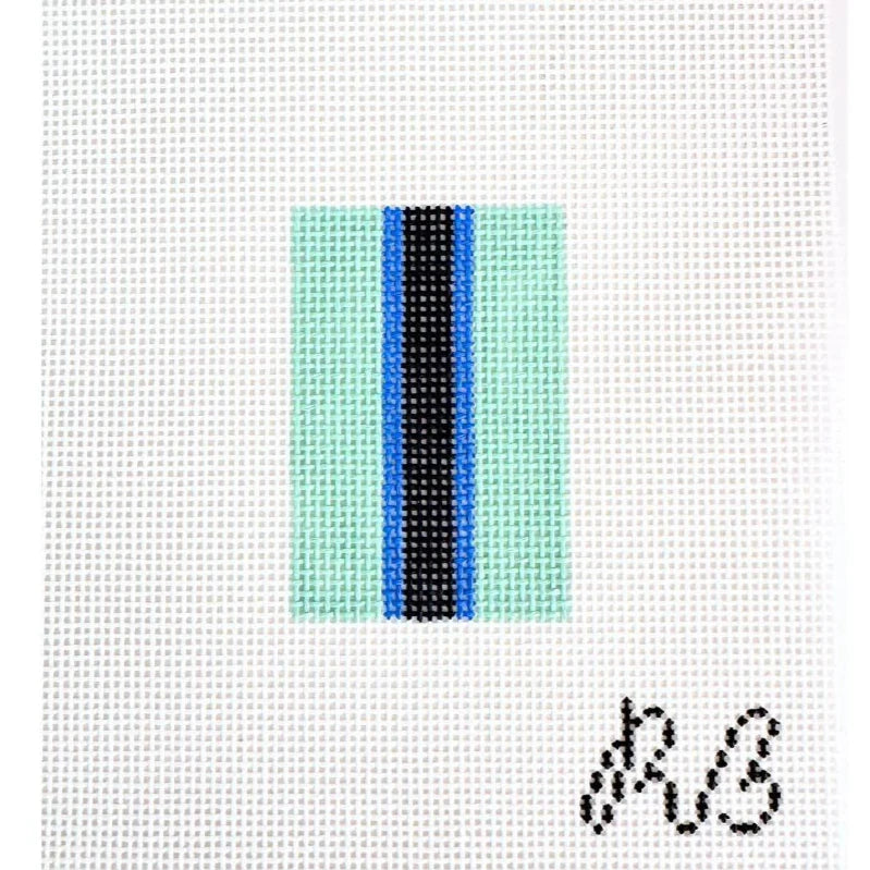 This hand painted needlepoint canvas by Rachel Barri features a simple striped pattern in seafoam, blue, and black. It fits Rachel Barri bag tags.