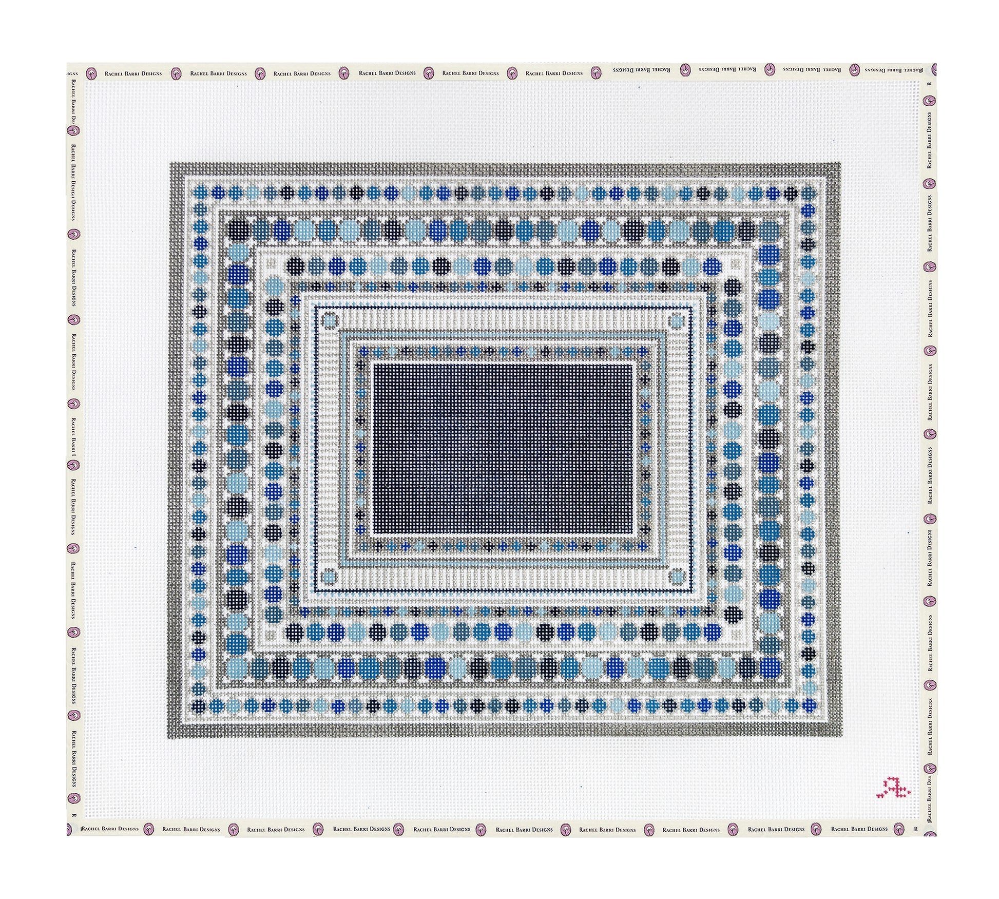 This is a stitch painted needlepoint canvas by Rachel Barri. It features a challah cover with a silver and blue frame.