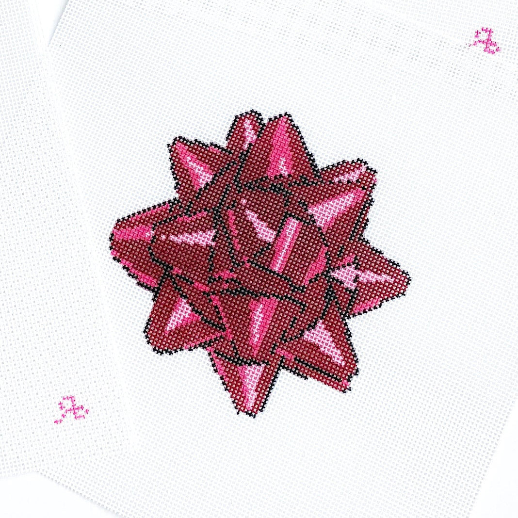 Hand painted needlepoint canvas by Rachel Barri featuring a classic holiday bow. It can fit a Rachel Barri 5" square self-finishing jewelry box.