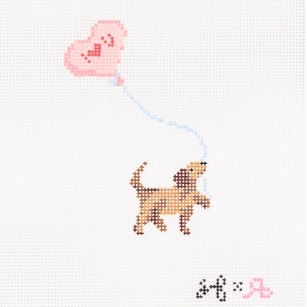 A beautiful hand painted needlepoint design from Rachel Barri in collaboration with Sabina Fenn Illustration. It features a puppy holding an "I love you" balloon.