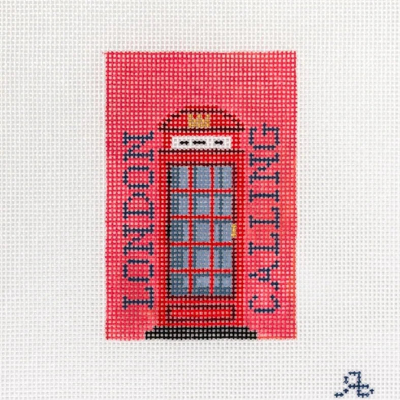 This hand painted needlepoint canvas by Rachel Barri features a classic British telephone booth with "London Calling"..