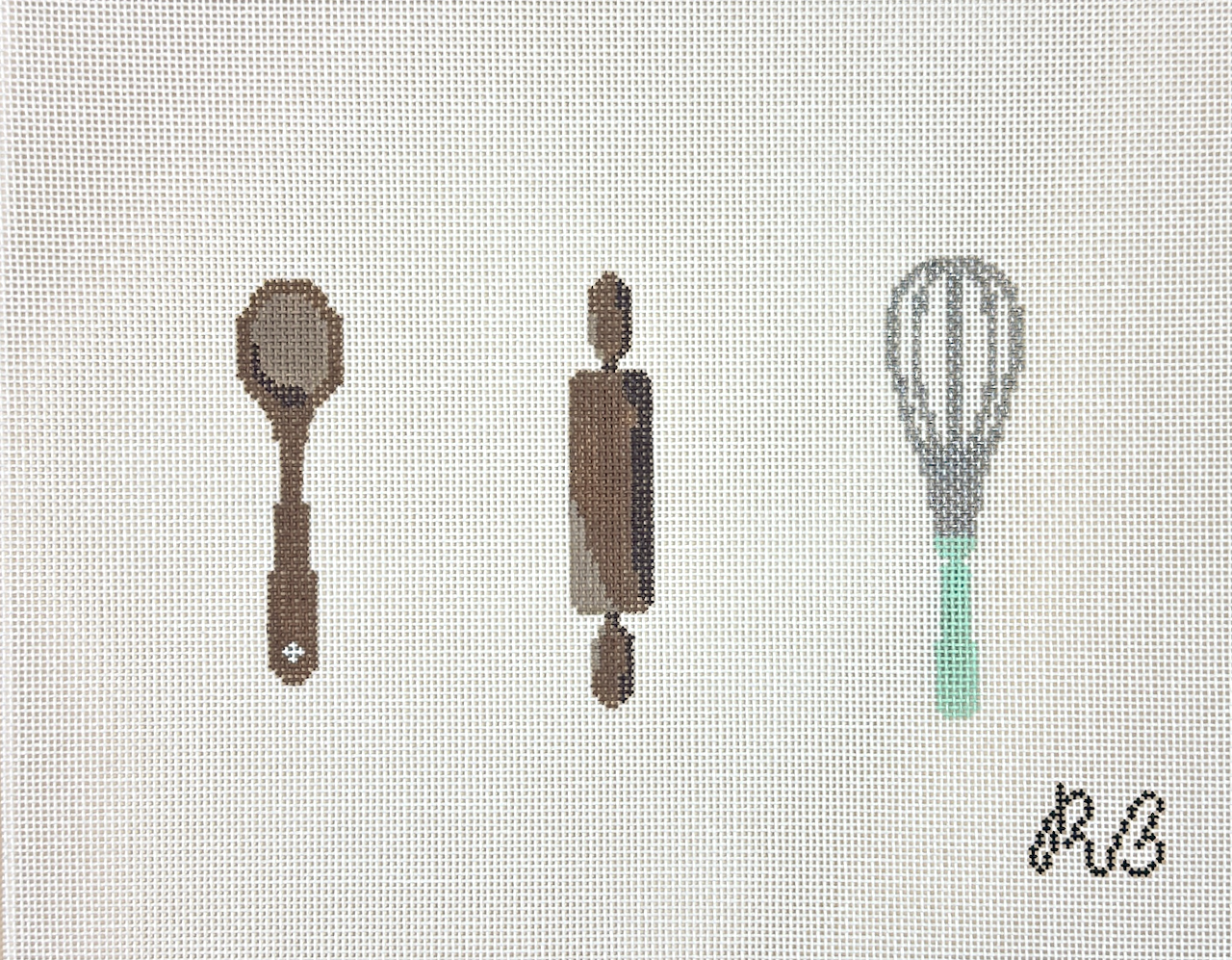 This is a set of 3 mini needlepoint canvases by Rachel Barri. They feature hand painted kitchen utensils including a whisk, rolling pin, and wooden spoon.
