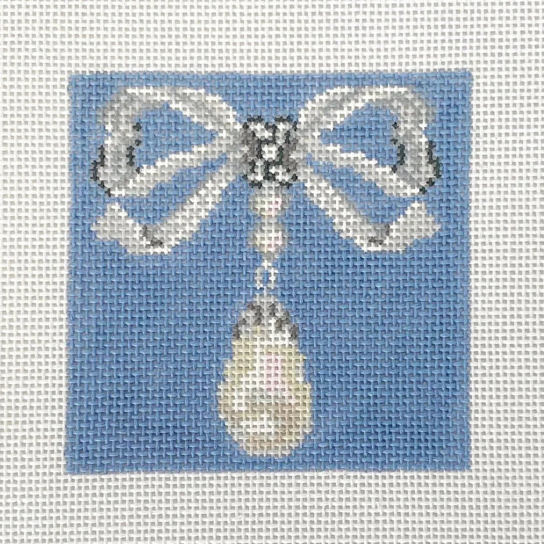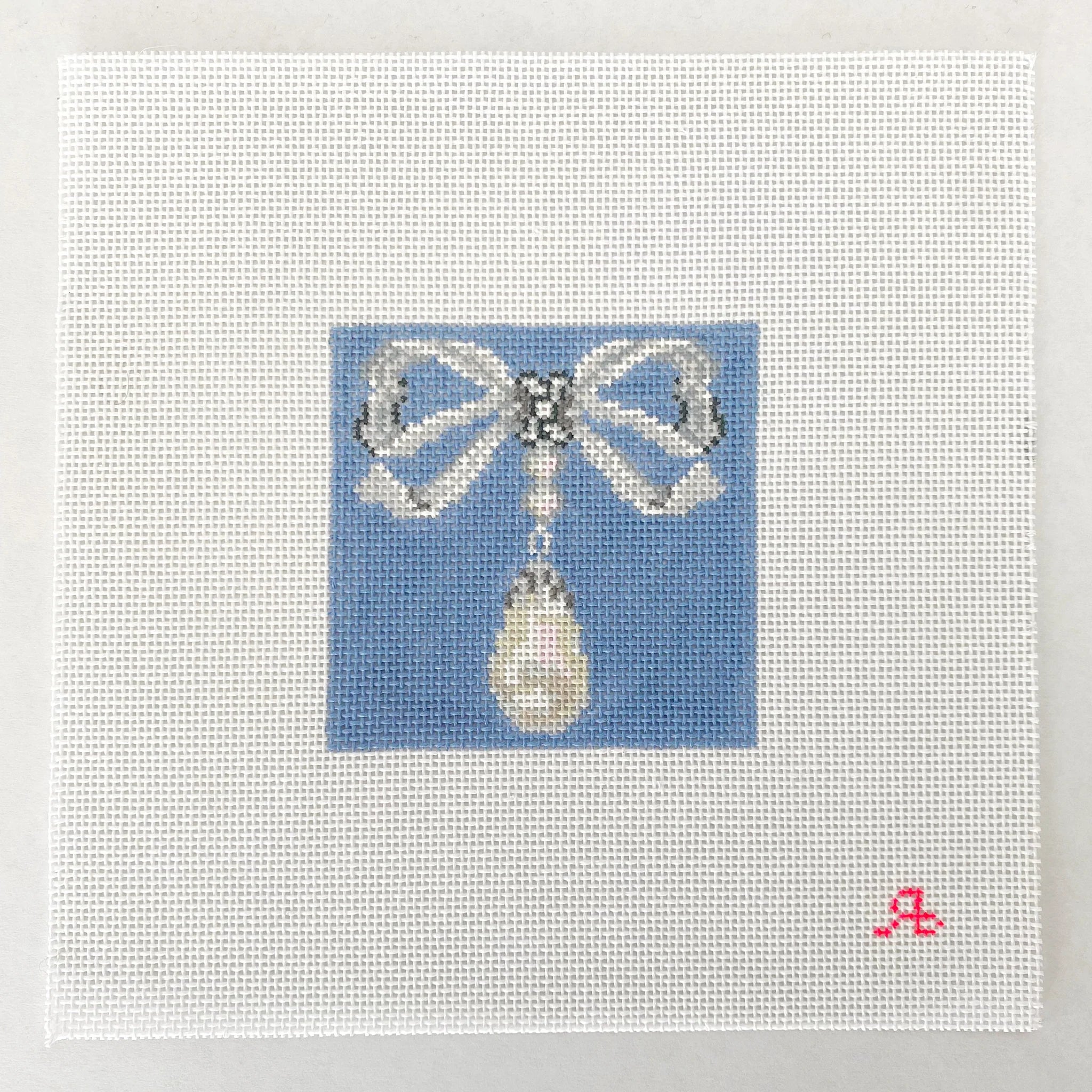 This is a hand painted needlepoint canvas by Rachel Barri featuring a piece of jewelry with a bow and pearl drop. It is sized to fit the Rachel Barri 4" square self-finishing jewelry box and other other self-finishing styles that take a 3" square canvas.