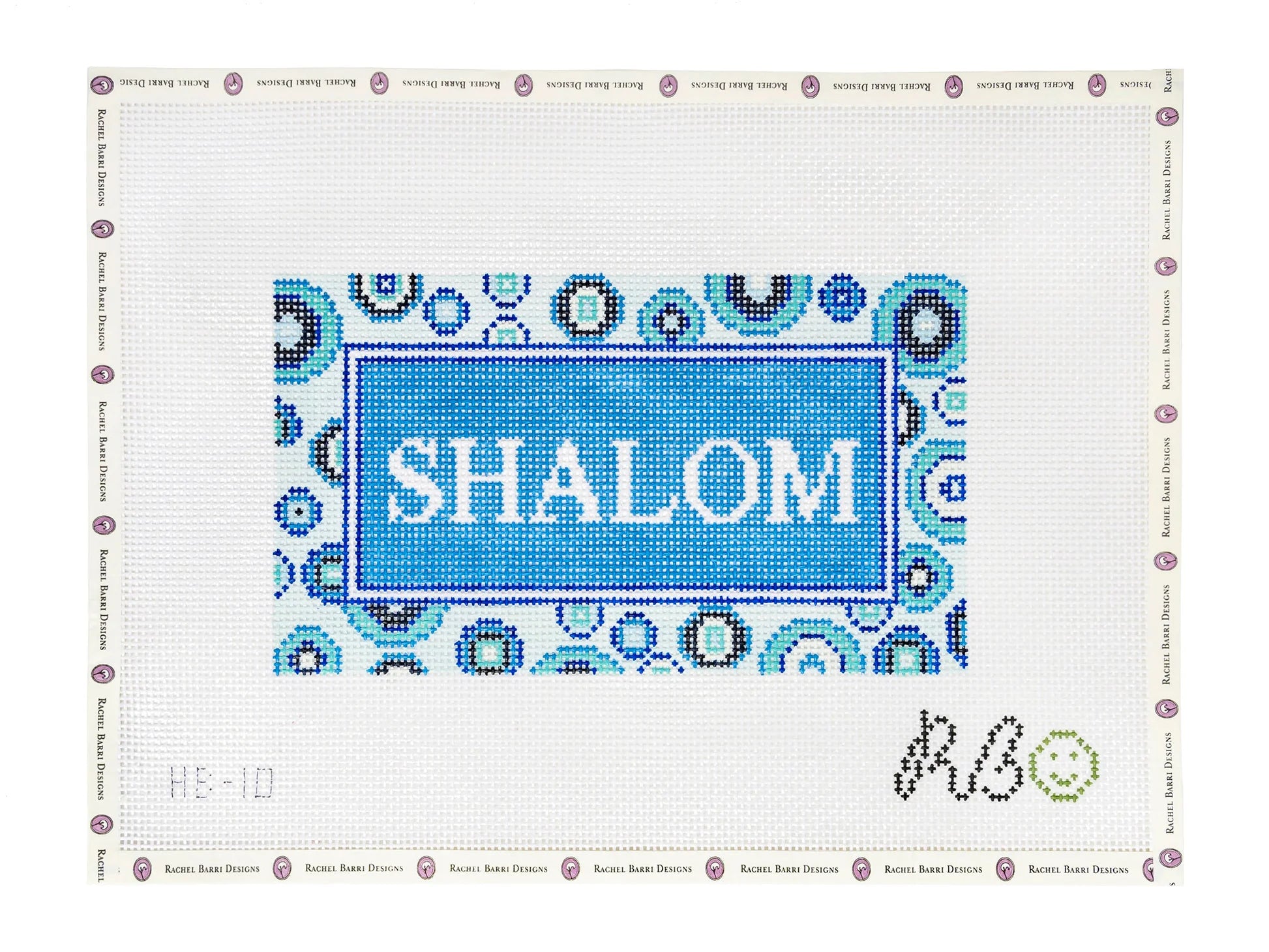 This is a stitch painted needlepoint canvas by Rachel Barri. It features a sign that reads "Shalom" on a frame of evil eyes.