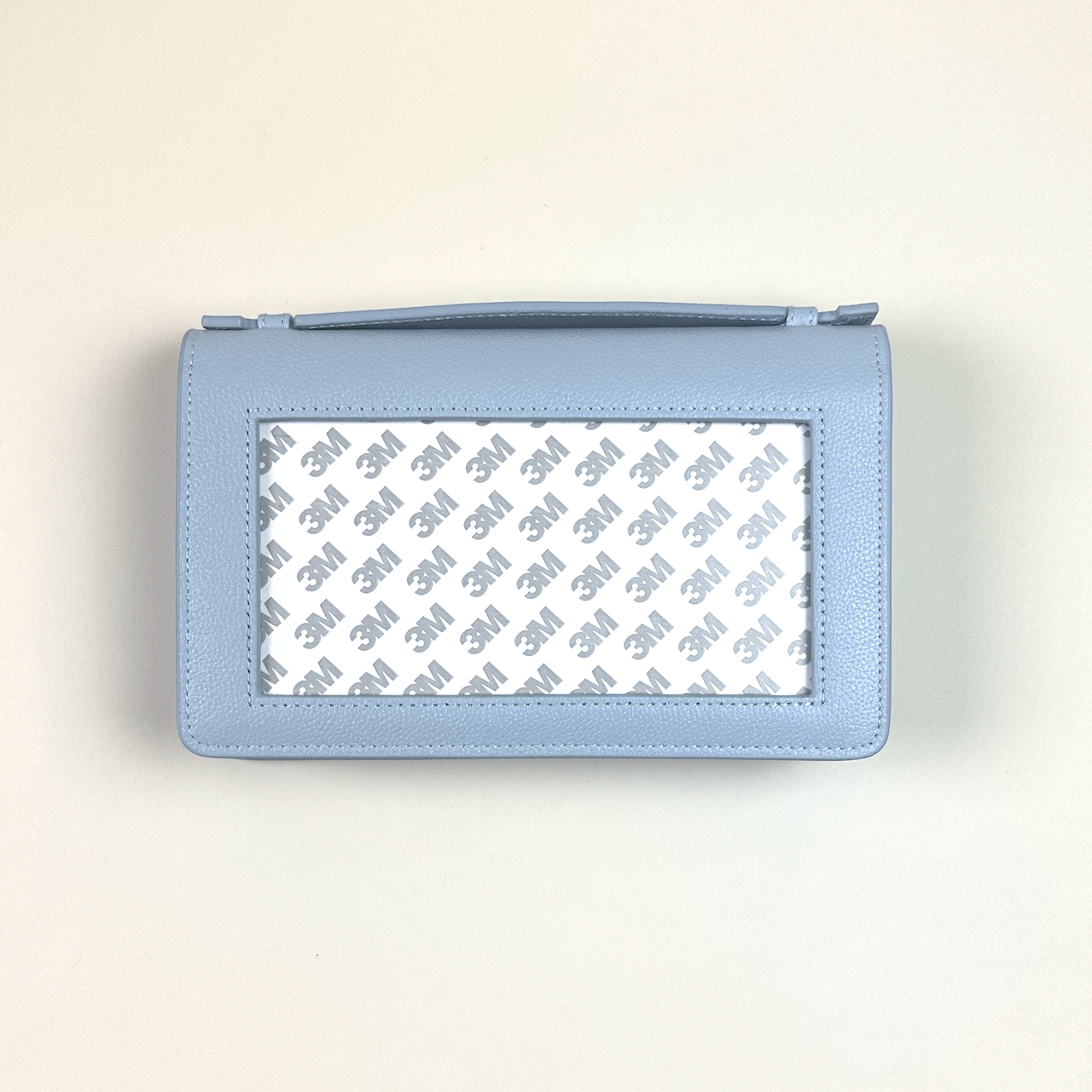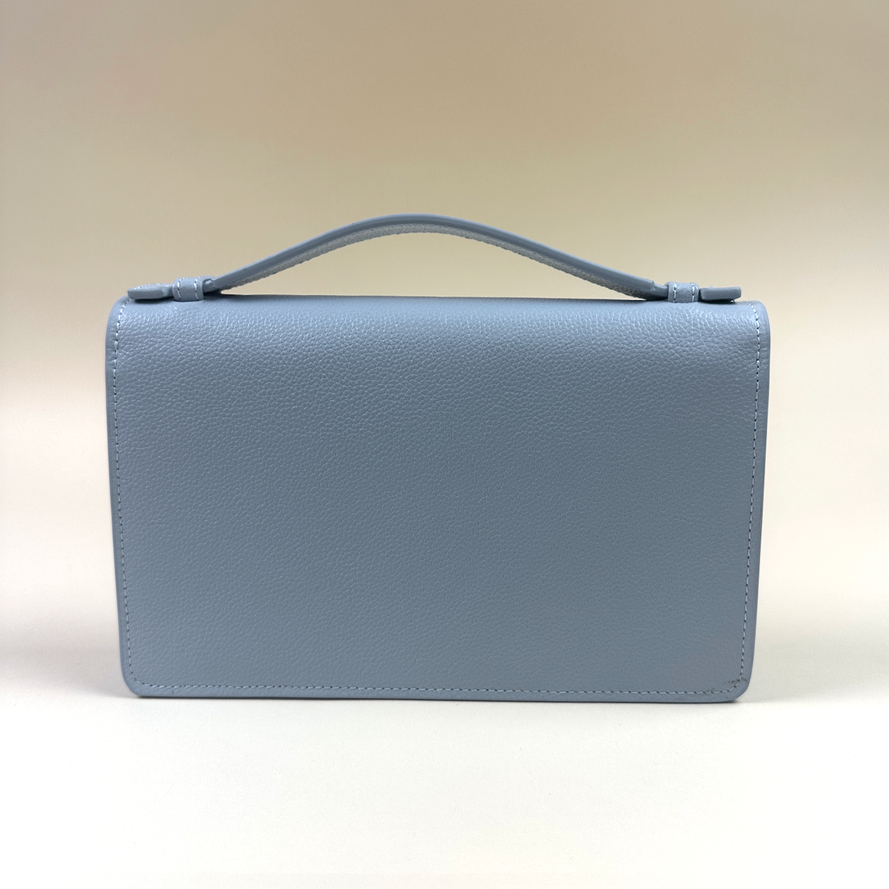 This is a pebble leather self finishing purse by Rachel Barri, in Baby Blue (light greyish blue), with a silver chain. It can be used as a top handle clutch or worn with its detachable chain as a cross body bag. The interior is also pebble leather and features 6 card slots and a zip pocket. The interior can accommodate most cell phones along with a small personal item or two, like a lipstick. It has a magnetic snap closure.