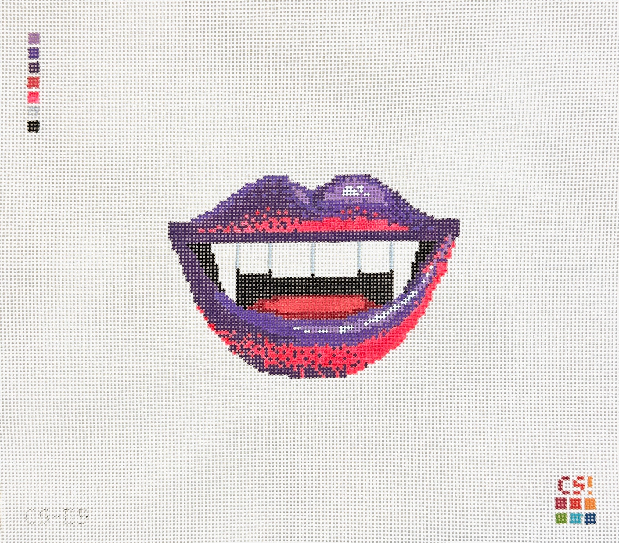 This is a hand painted needlepoint canvas by The Colorful Stitch from Rachel Barri. It features a vampire's mouth and fangs.