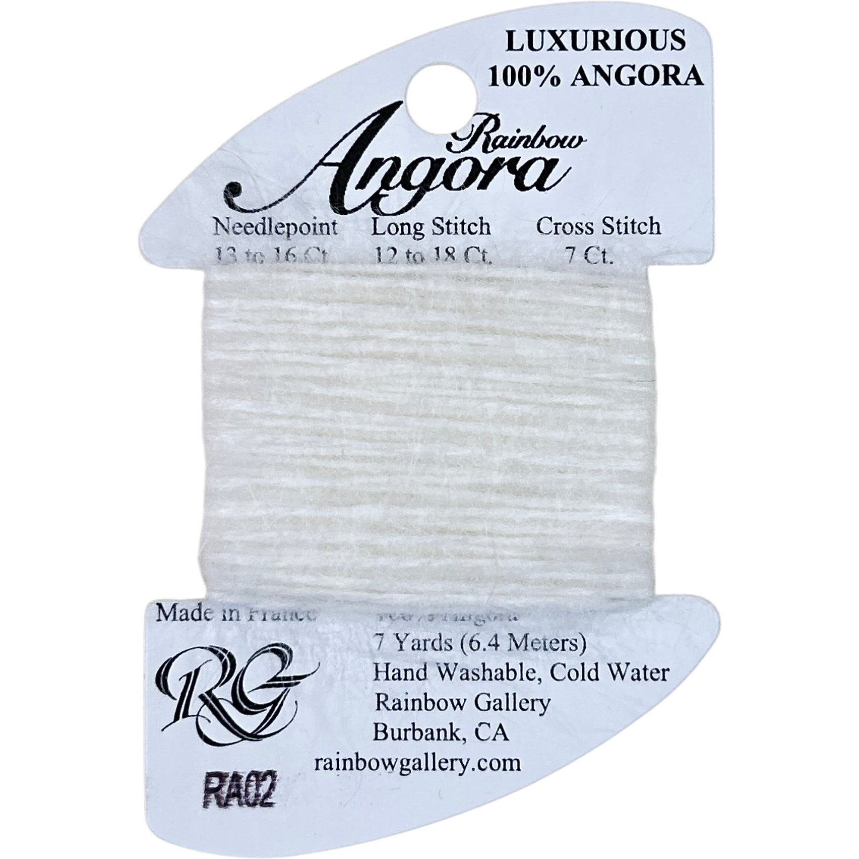 This is Angora from Rainbow Gallery in color 02 Off White. Made with real Angora! Perfect for fur and beards. 2 or 3 ply on 13 mesh, 1 or 2 ply on 18 mesh.