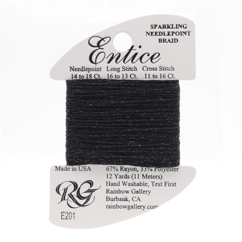 This is Entice from Rainbow Gallery in color 201 Jet Black. A gently sparkly thread that is perfect for adding some shine to any project. Use as-is on 18 mesh.
