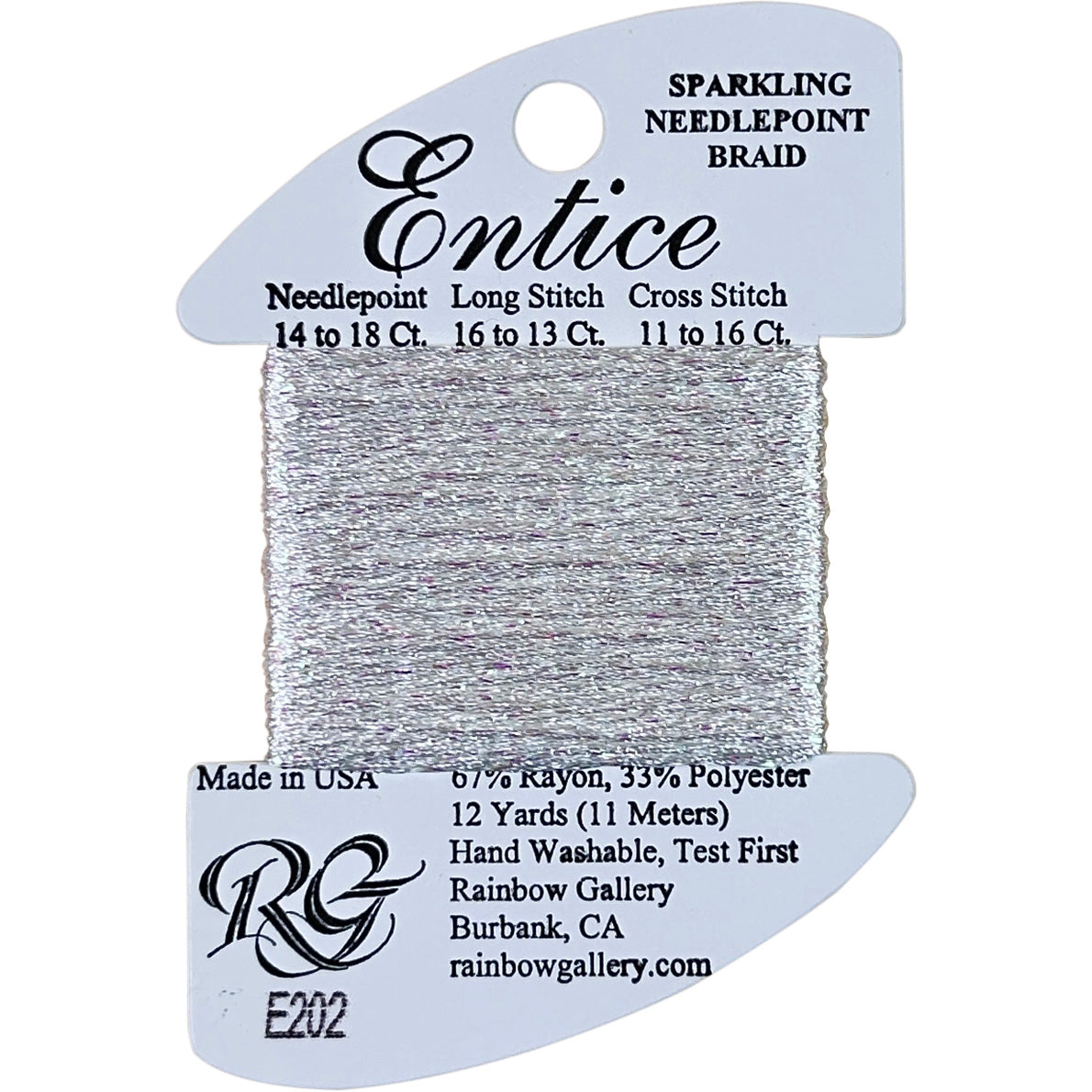 This is Entice from Rainbow Gallery in color 202 Snow White. A gently sparkly thread that is perfect for adding some shine to any project. Use as-is on 18 mesh.