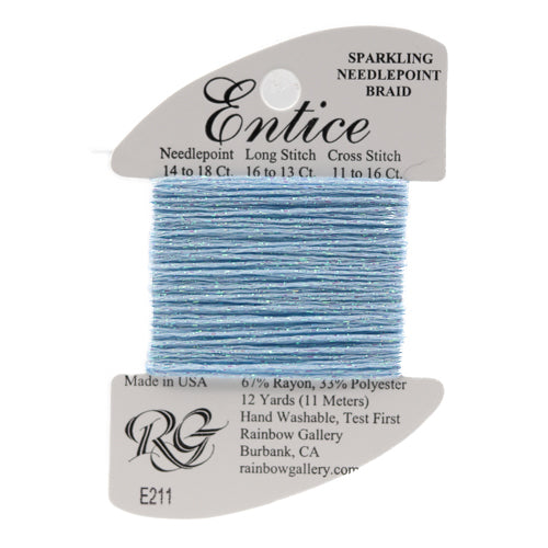 This is Entice from Rainbow Gallery in color 211 Twinkle Blue. A gently sparkly thread that is perfect for adding some shine to any project. Use as-is on 18 mesh.