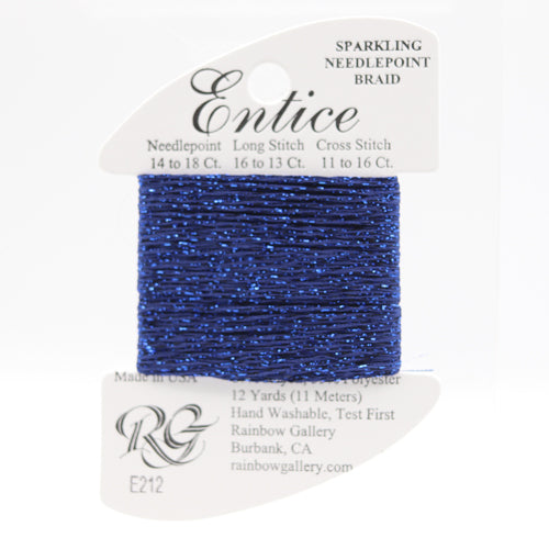 This is Entice from Rainbow Gallery in color 212 Navy. A gently sparkly thread that is perfect for adding some shine to any project. Use as-is on 18 mesh.