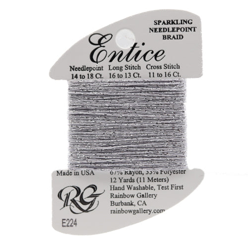 This is Entice from Rainbow Gallery in color 224 Silver. A gently sparkly thread that is perfect for adding some shine to any project. Use as-is on 18 mesh.