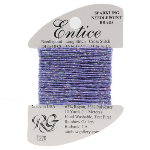 This is Entice from Rainbow Gallery in color 226 Periwinkle. A gently sparkly thread that is perfect for adding some shine to any project. Use as-is on 18 mesh.