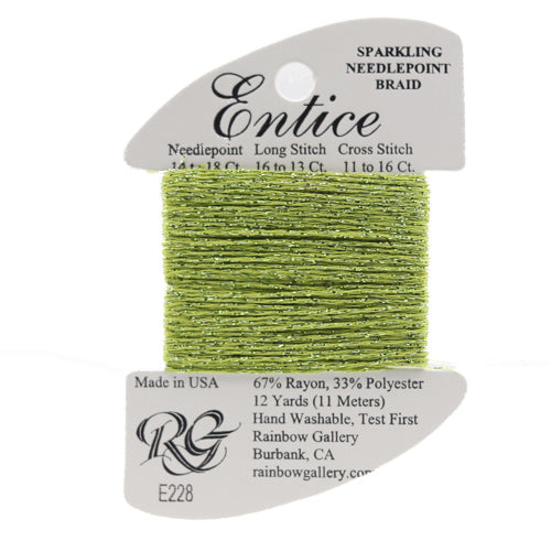 This is Entice from Rainbow Gallery in color 228 Chartreuse. A gently sparkly thread that is perfect for adding some shine to any project. Use as-is on 18 mesh.