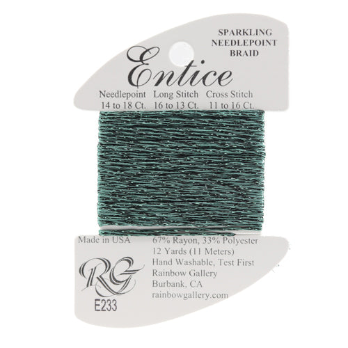 This is Entice from Rainbow Gallery in color 233 Spruce. A gently sparkly thread that is perfect for adding some shine to any project. Use as-is on 18 mesh.