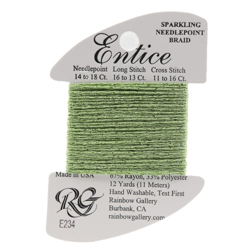 This is Entice from Rainbow Gallery in color 234 Aspen Green. A gently sparkly thread that is perfect for adding some shine to any project. Use as-is on 18 mesh.