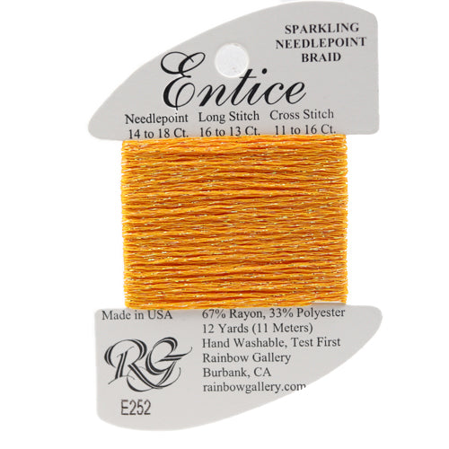 This is Entice from Rainbow Gallery in color 252 Radiant Yellow. A gently sparkly thread that is perfect for adding some shine to any project. Use as-is on 18 mesh.