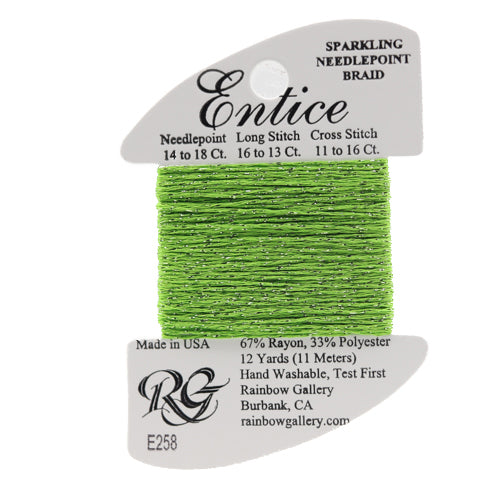 This is Entice from Rainbow Gallery in color 258 Jasmine Green. A gently sparkly thread that is perfect for adding some shine to any project. Use as-is on 18 mesh.