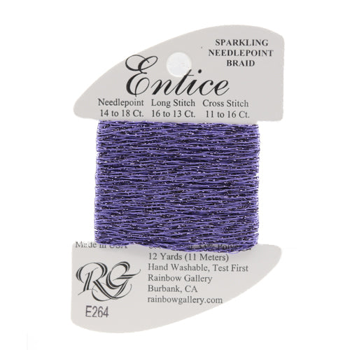 This is Entice from Rainbow Gallery in color 264 Passion Flower. A gently sparkly thread that is perfect for adding some shine to any project. Use as-is on 18 mesh.
