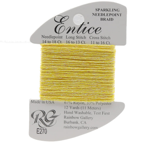 This is Entice from Rainbow Gallery in color 270 Rubber Ducky. A gently sparkly thread that is perfect for adding some shine to any project. Use as-is on 18 mesh.