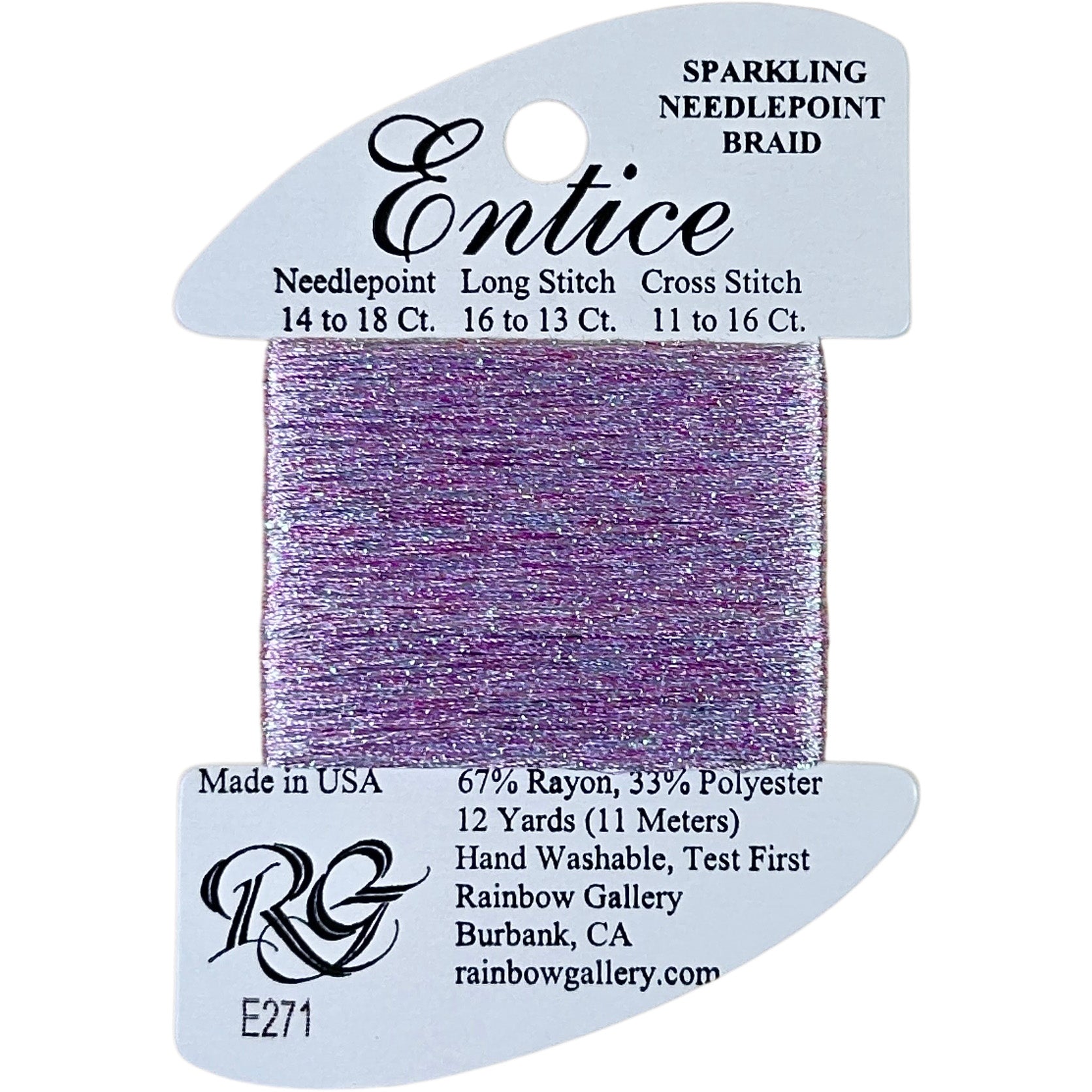 This is Entice from Rainbow Gallery in color 271 Orchid Ice. A gently sparkly thread that is perfect for adding some shine to any project. Use as-is on 18 mesh.