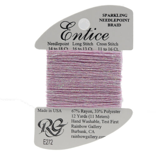 This is Entice from Rainbow Gallery in color 272 Beach Rose. A gently sparkly thread that is perfect for adding some shine to any project. Use as-is on 18 mesh.