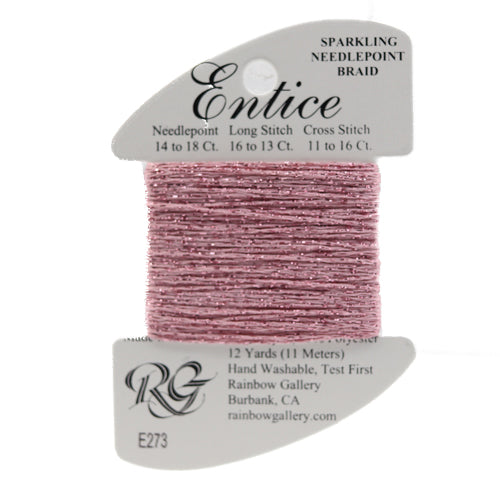 This is Entice from Rainbow Gallery in color 273 Cameo Pink. A gently sparkly thread that is perfect for adding some shine to any project. Use as-is on 18 mesh.