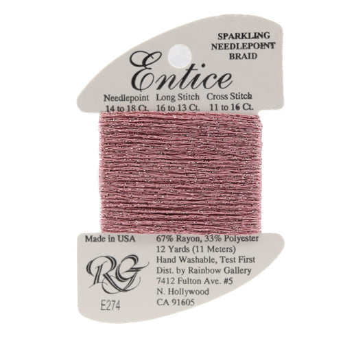 This is Entice from Rainbow Gallery in color 274 Bridal Rose. A gently sparkly thread that is perfect for adding some shine to any project. Use as-is on 18 mesh.