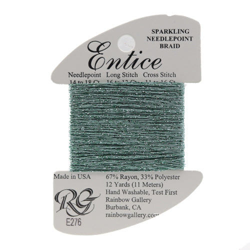 This is Entice from Rainbow Gallery in color 276 Lily Pad. A gently sparkly thread that is perfect for adding some shine to any project. Use as-is on 18 mesh.
