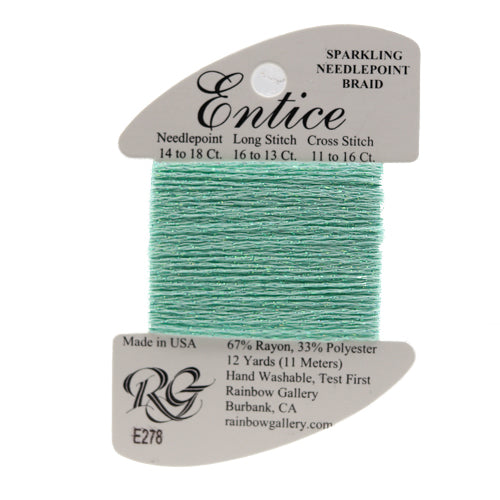 This is Entice from Rainbow Gallery in color 278 Ice Green. A gently sparkly thread that is perfect for adding some shine to any project. Use as-is on 18 mesh.