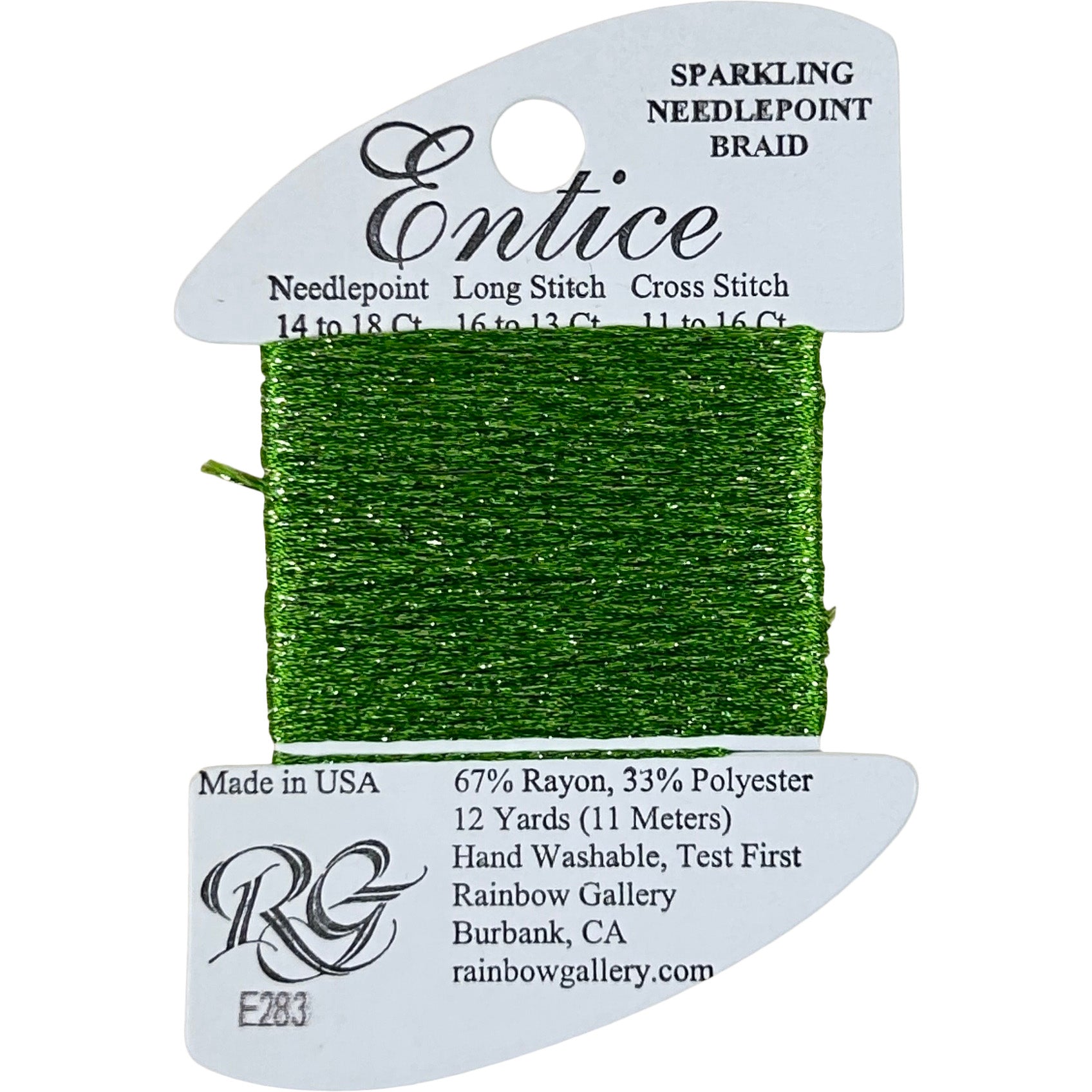 This is Entice from Rainbow Gallery in color 283 Greenery. A gently sparkly thread that is perfect for adding some shine to any project. Use as-is on 18 mesh.