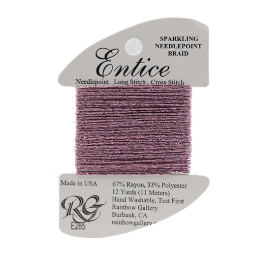 This is Entice from Rainbow Gallery in color 285 Mauvelous. A gently sparkly thread that is perfect for adding some shine to any project. Use as-is on 18 mesh.