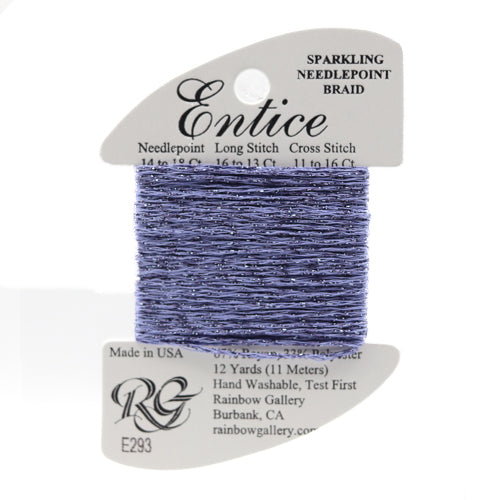 This is Entice from Rainbow Gallery in color 293 Jacaranda. A gently sparkly thread that is perfect for adding some shine to any project. Use as-is on 18 mesh.