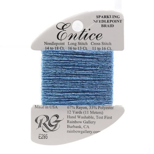 This is Entice from Rainbow Gallery in color 295 Vivid Blue. A gently sparkly thread that is perfect for adding some shine to any project. Use as-is on 18 mesh.