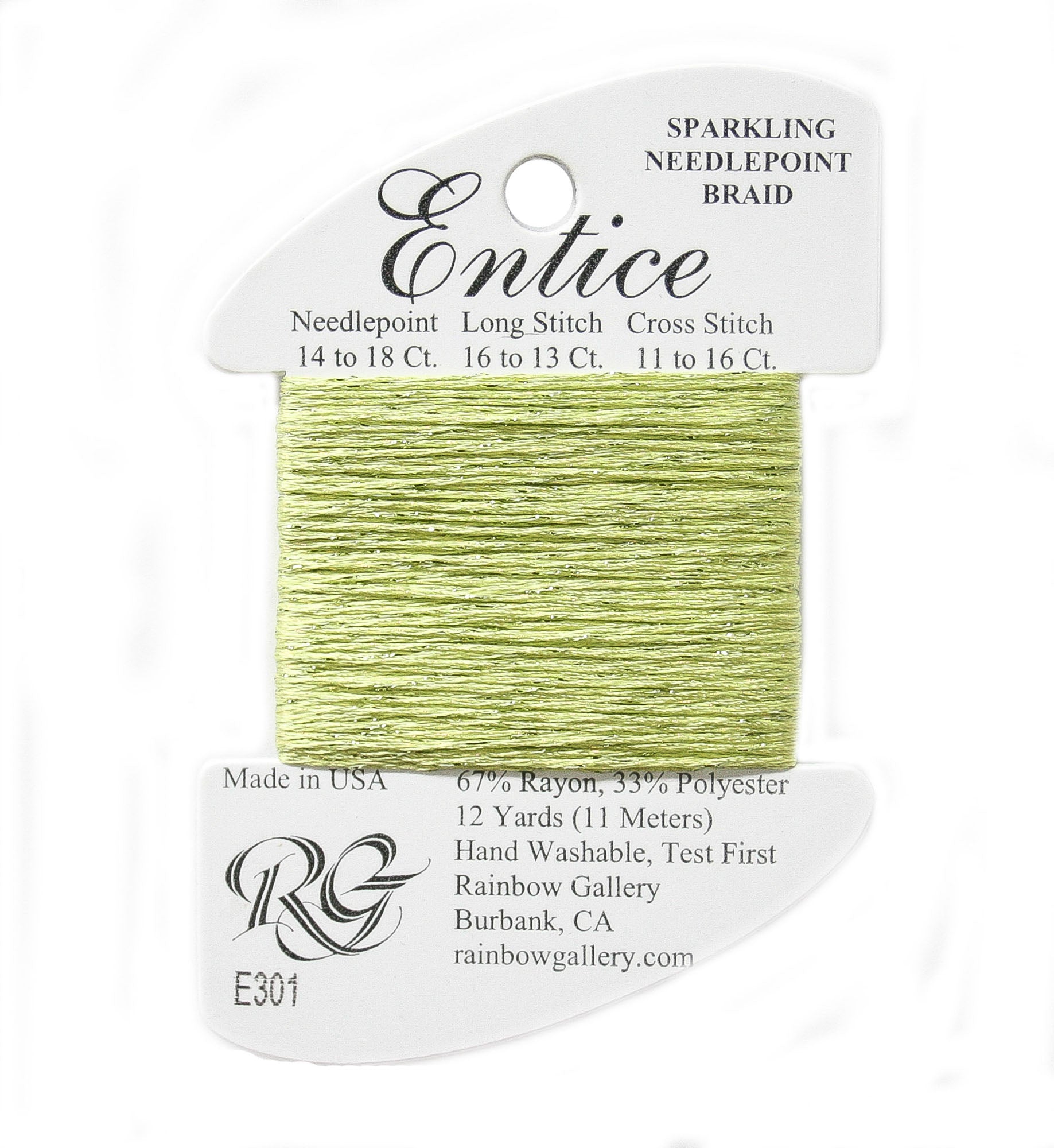 This is Entice from Rainbow Gallery in color 301 Daiquiri Green. A gently sparkly thread that is perfect for adding some shine to any project. Use as-is on 18 mesh.