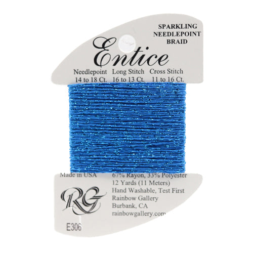 This is Entice from Rainbow Gallery in color 306 Electric Blue. A gently sparkly thread that is perfect for adding some shine to any project. Use as-is on 18 mesh.